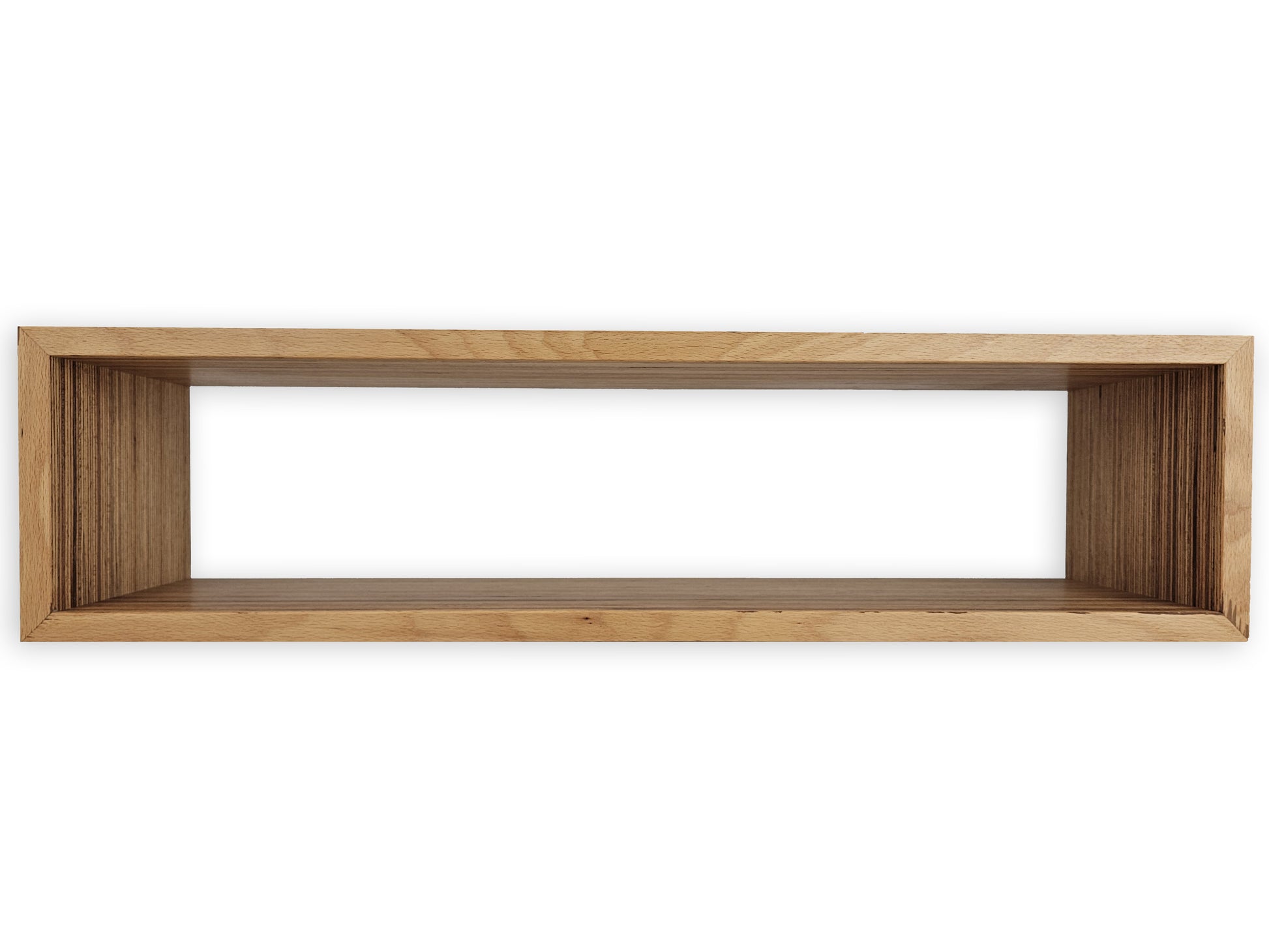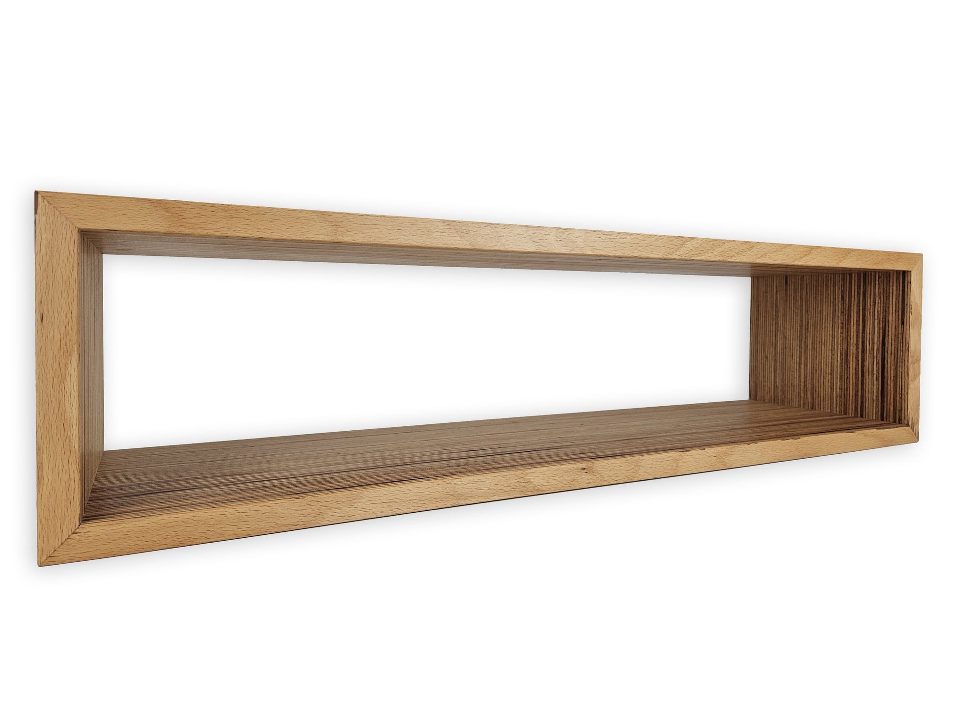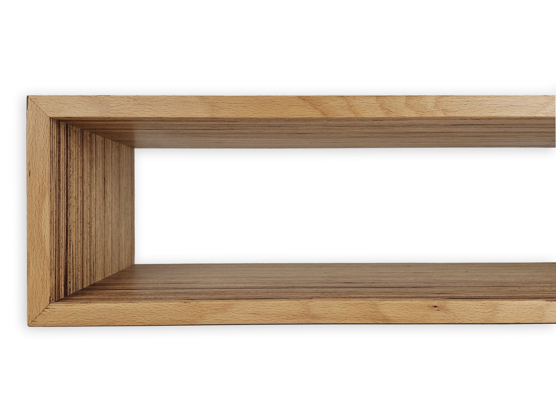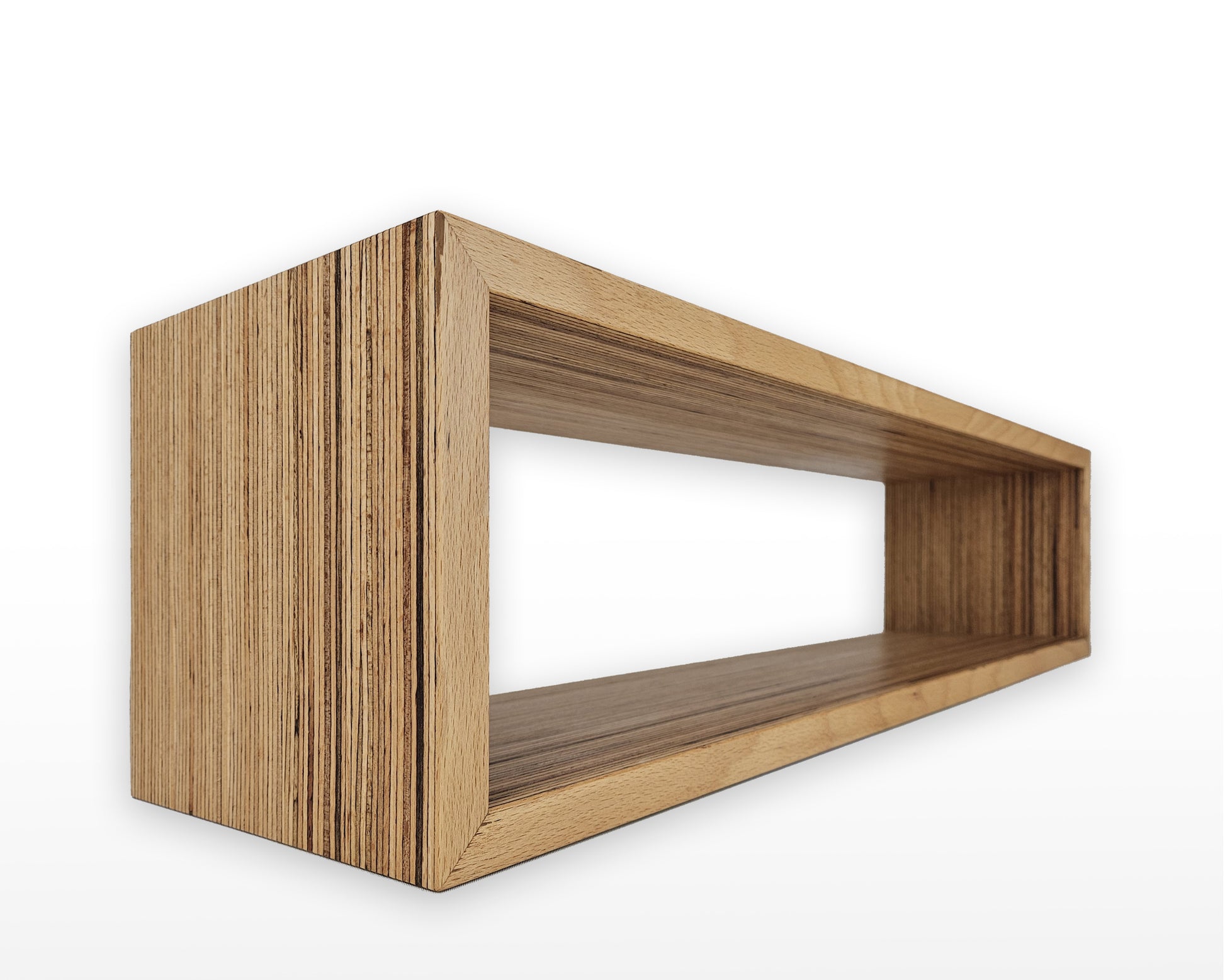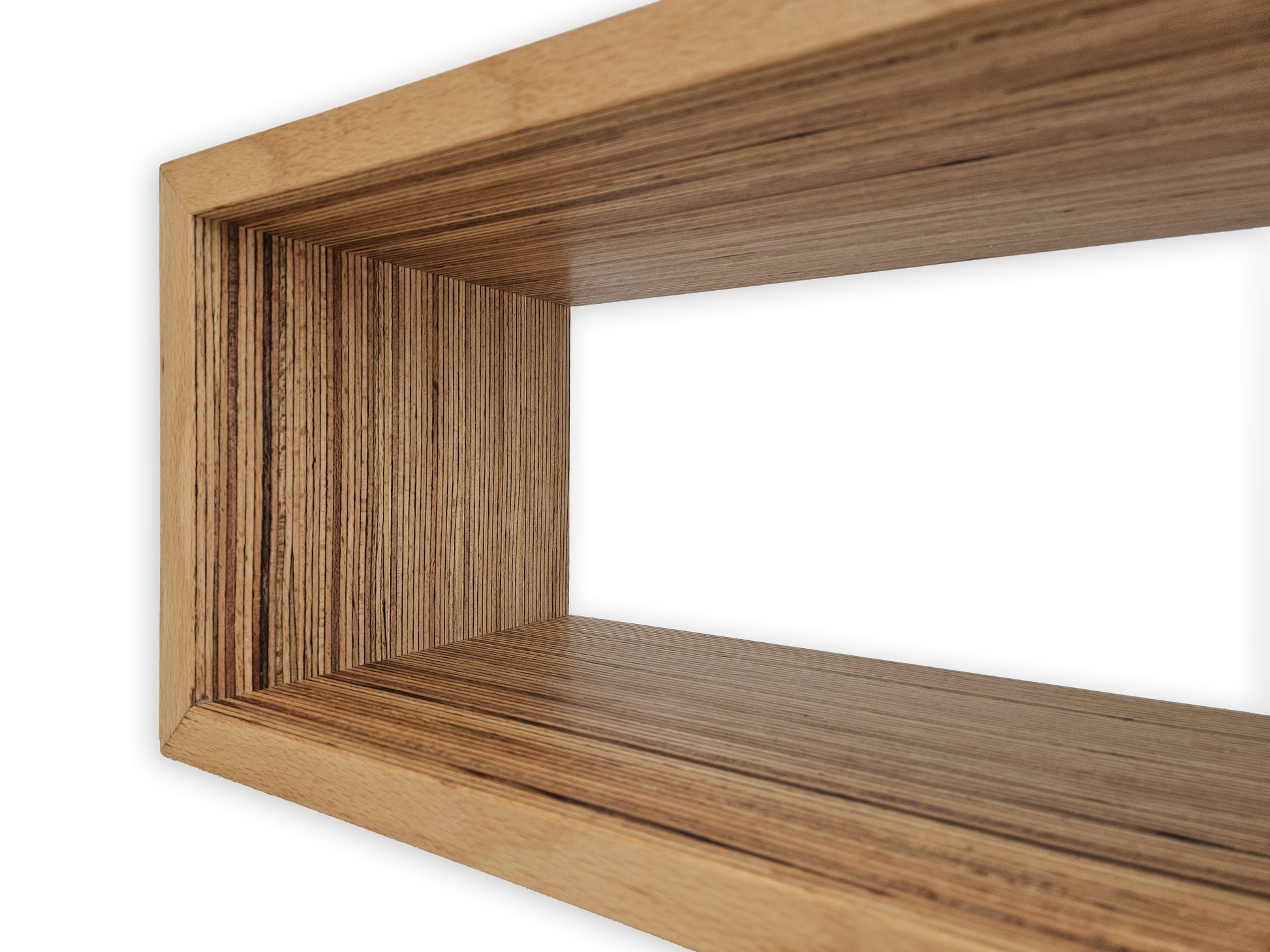 Durch die mehrlagige Verleimung entsteht ein besonders belastbares Regal, das sich ideal für Bücher, Dekoration oder Pflanzen eignet. Dank der unsichtbaren Wandbefestigung lässt sich das Regal einfach montieren und wirkt elegant schwebend an der Wand, während es jedem Raum eine warme, natürliche Ausstrahlung verleiht.