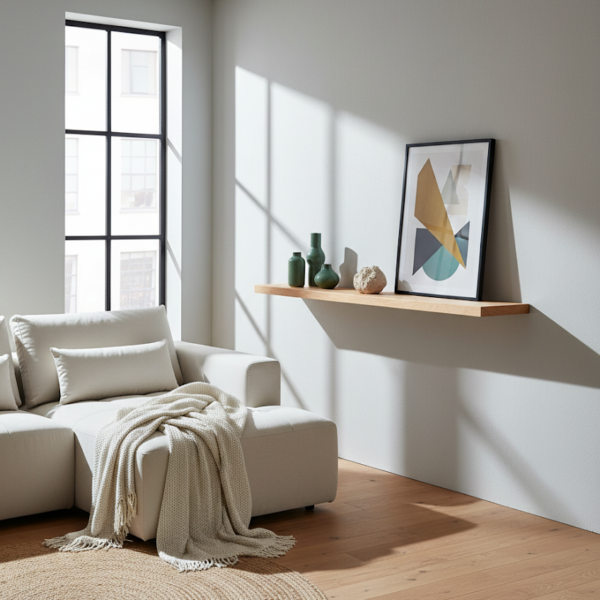 Du bestimmst die Länge (20–290 cm), Tiefe und Stärke. Auf Wunsch mit echter Baumkante für ein besonders naturverbundenes Erscheinungsbild. Durch unsere verdeckte Aufhängung wirkt das Regal schwebend und elegant – ganz ohne sichtbare Winkel. -