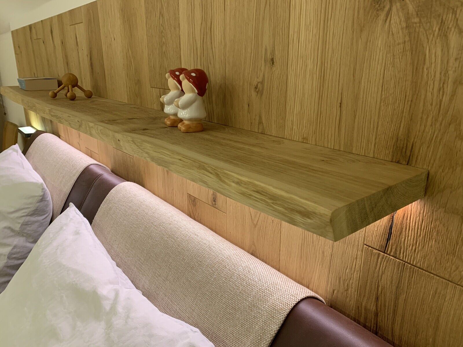 Du bestimmst die Länge (20–290 cm), Tiefe und Stärke. Auf Wunsch mit echter Baumkante für ein besonders naturverbundenes Erscheinungsbild. Durch unsere verdeckte Aufhängung wirkt das Regal schwebend und elegant – ganz ohne sichtbare Winkel. -
