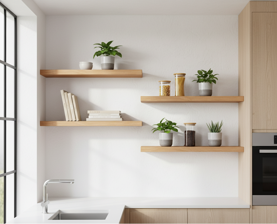 Du bestimmst die Länge (20–290 cm), Tiefe und Stärke. Auf Wunsch mit echter Baumkante für ein besonders naturverbundenes Erscheinungsbild. Durch unsere verdeckte Aufhängung wirkt das Regal schwebend und elegant – ganz ohne sichtbare Winkel. -