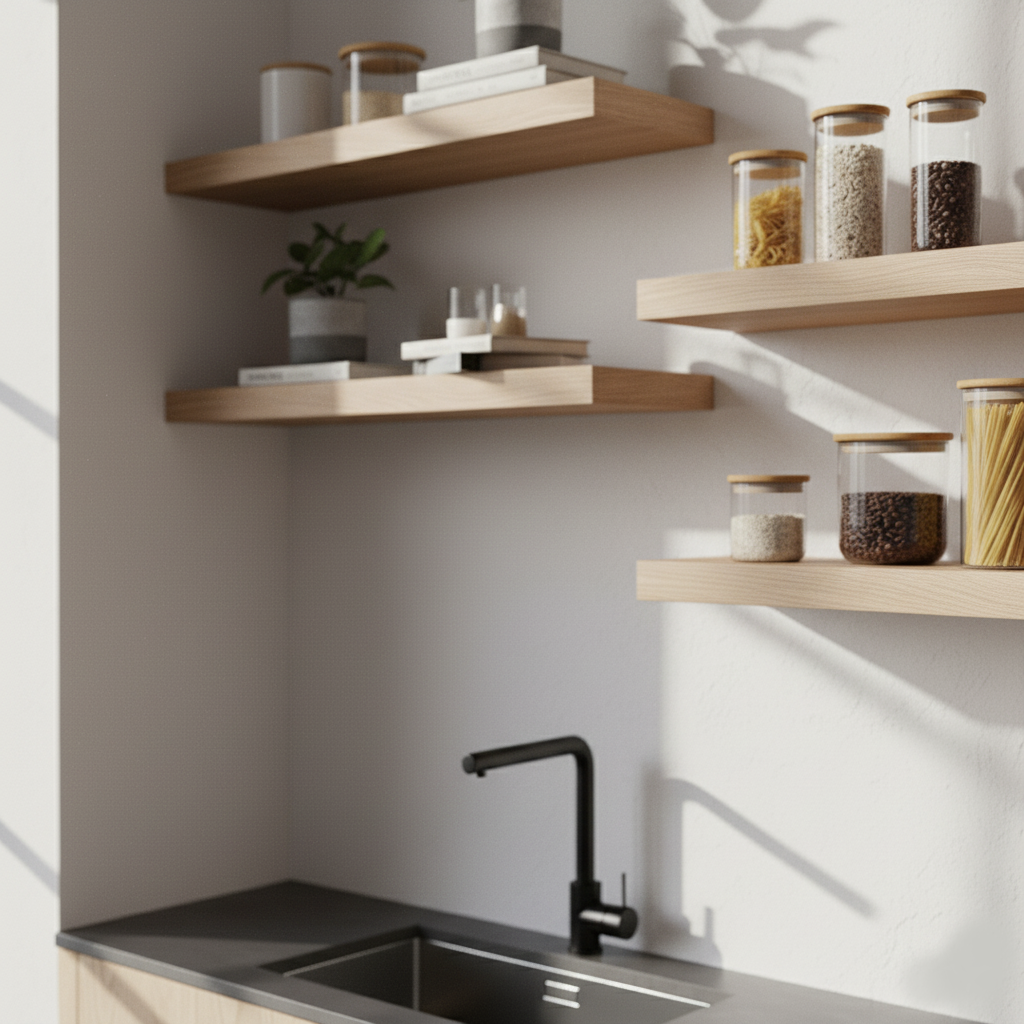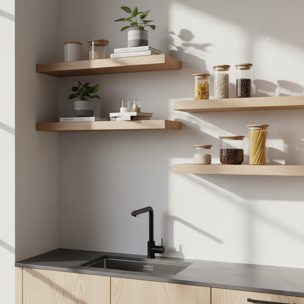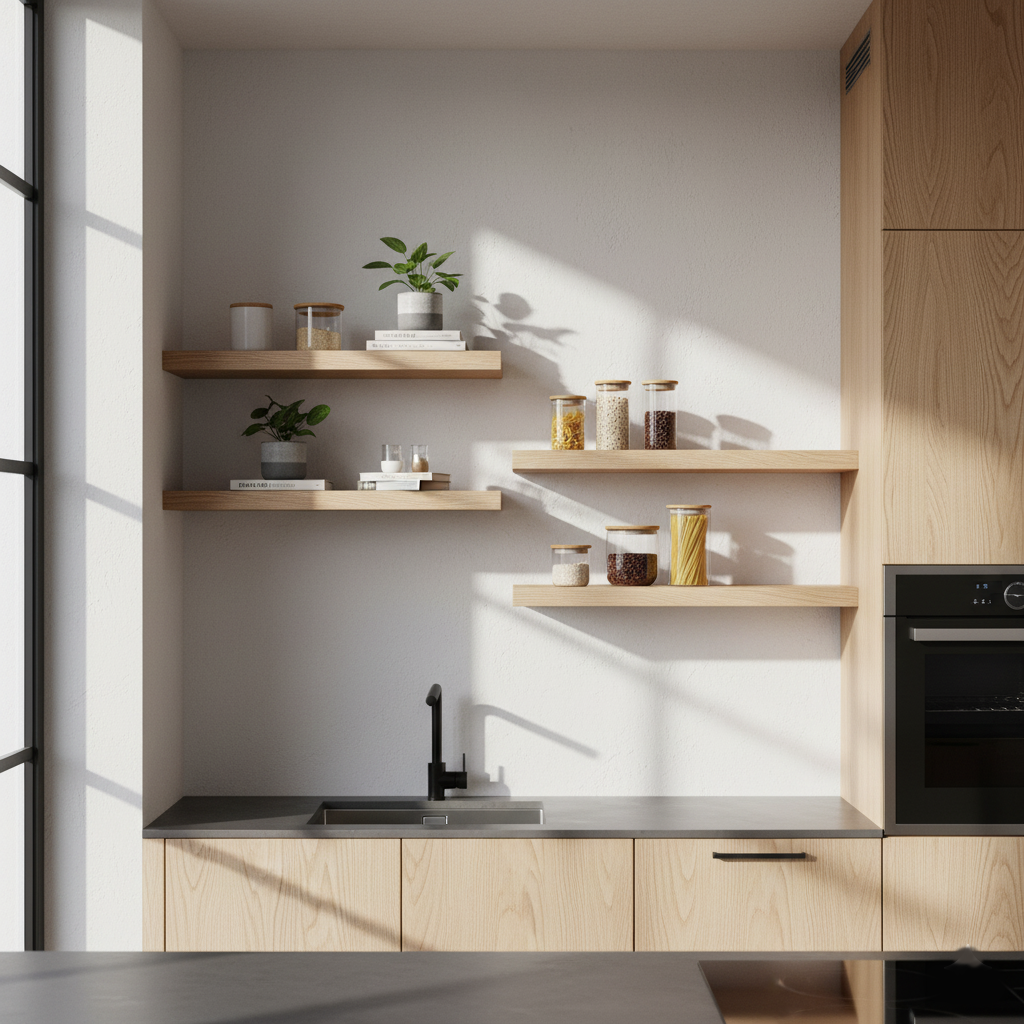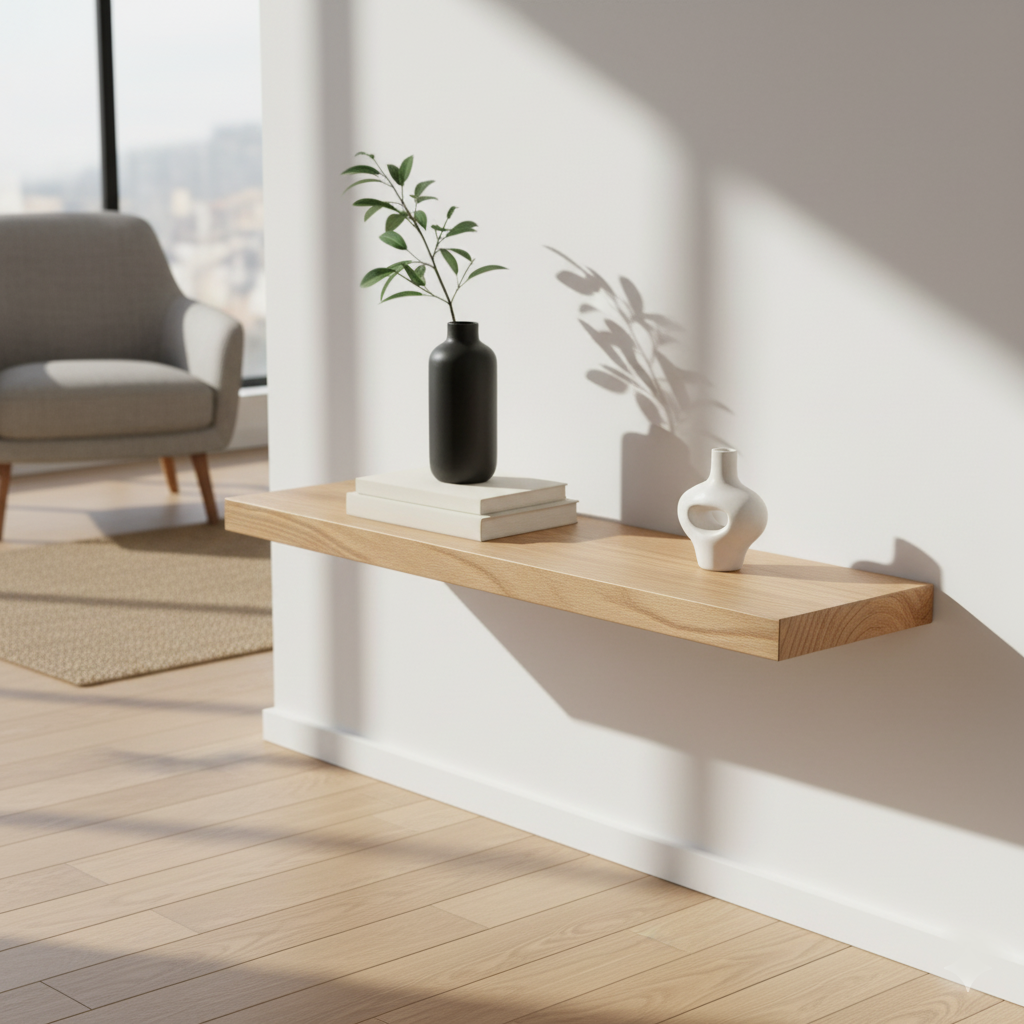 Die schwebende Befestigung betont die Leichtigkeit, während das stabile Eschenholz eine lange Lebensdauer garantiert. Ideal für moderne und klassische Einrichtungen.