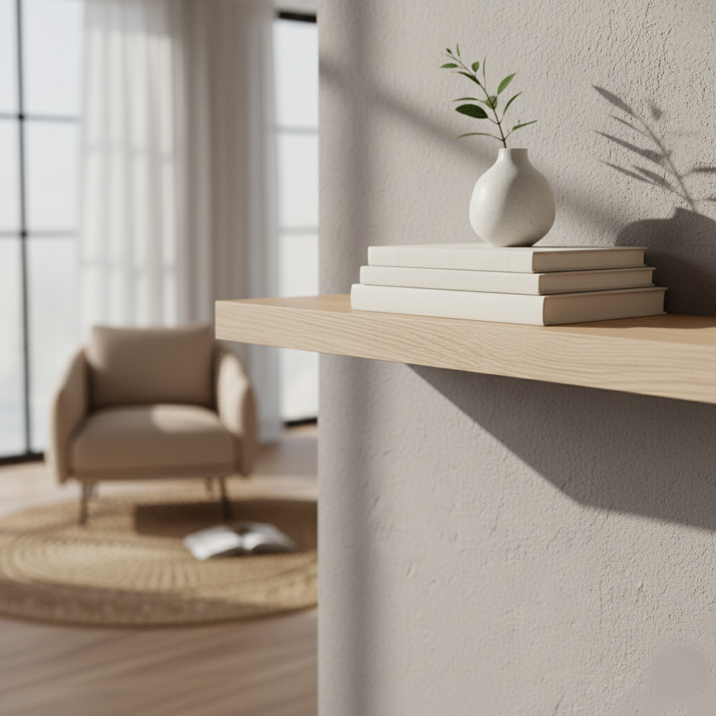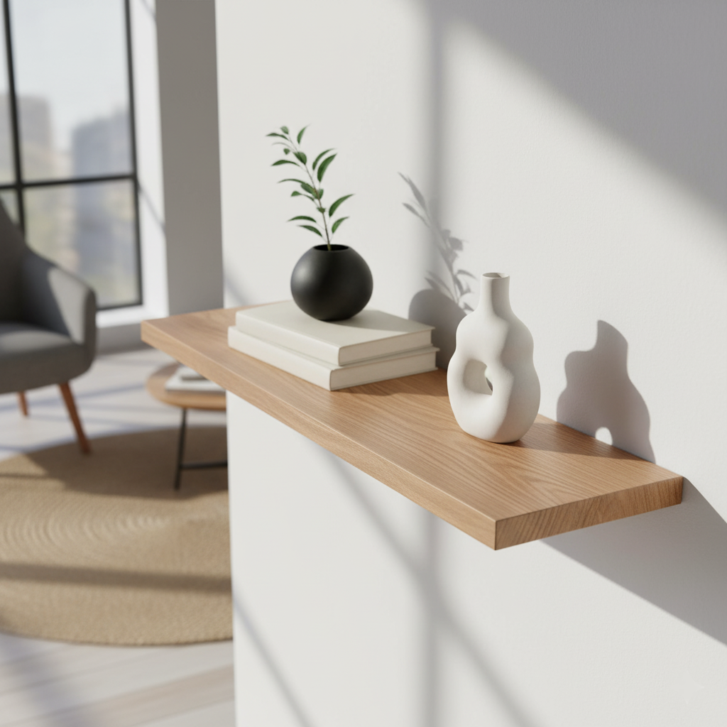 Du bestimmst die Länge (20–290 cm), Tiefe und Stärke. Auf Wunsch mit echter Baumkante für ein besonders naturverbundenes Erscheinungsbild. Durch unsere verdeckte Aufhängung wirkt das Regal schwebend und elegant – ganz ohne sichtbare Winkel. -