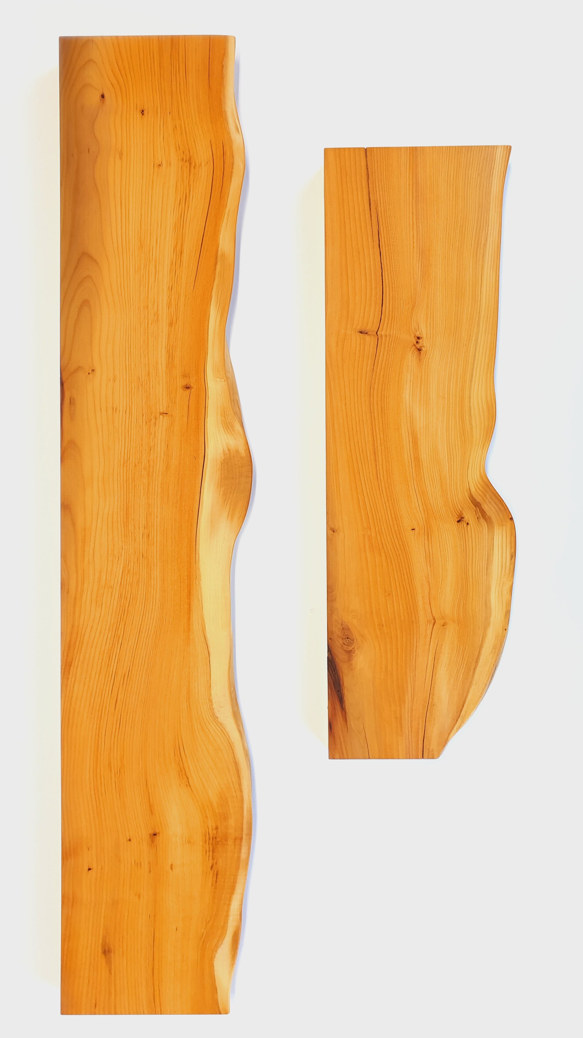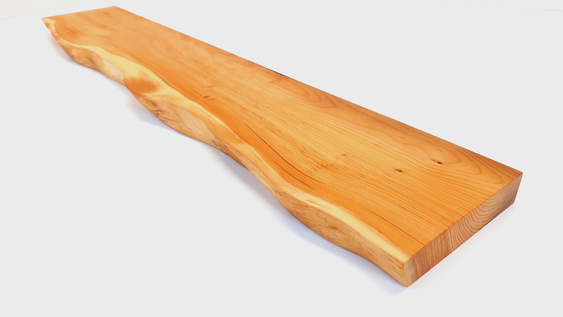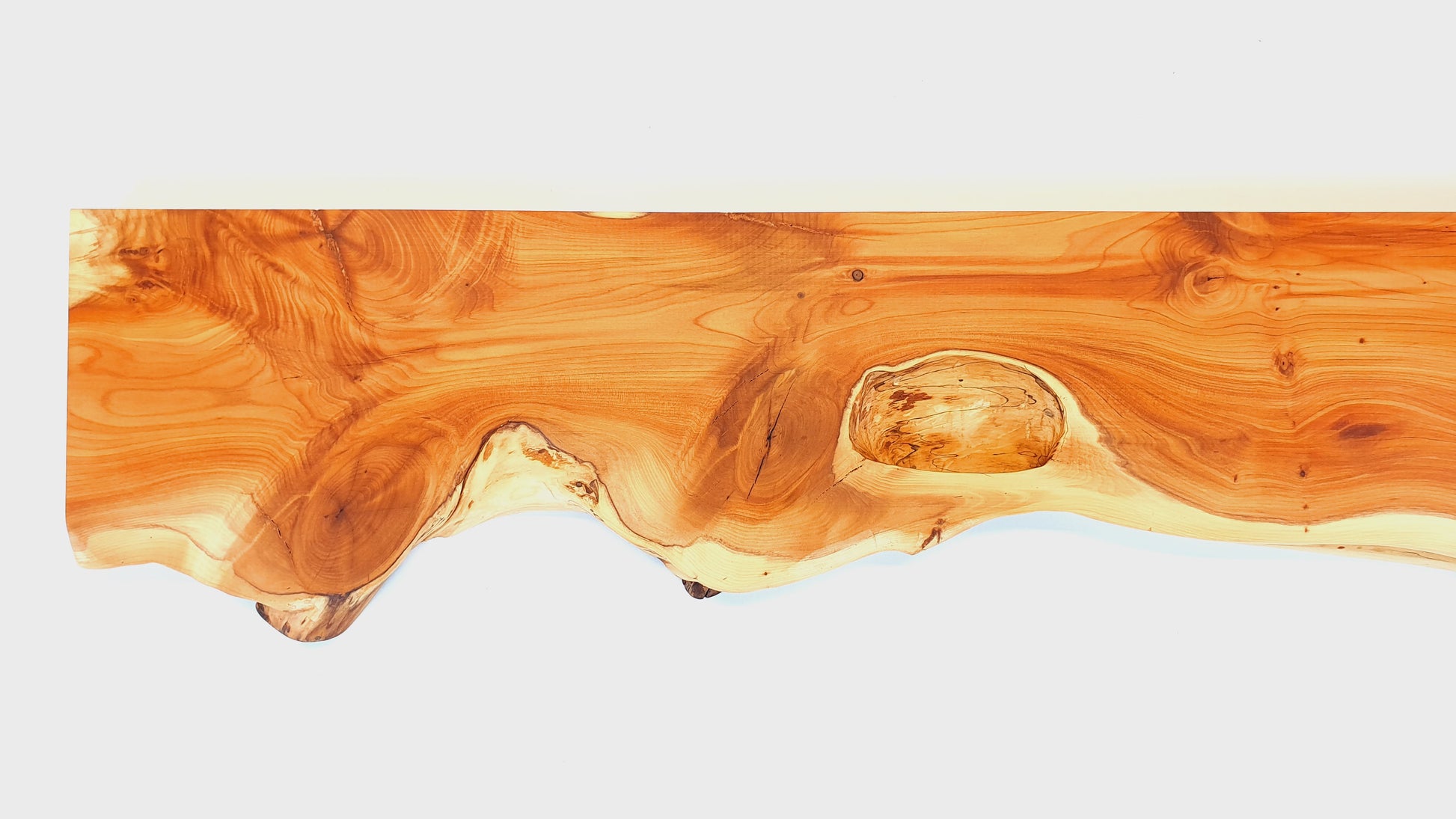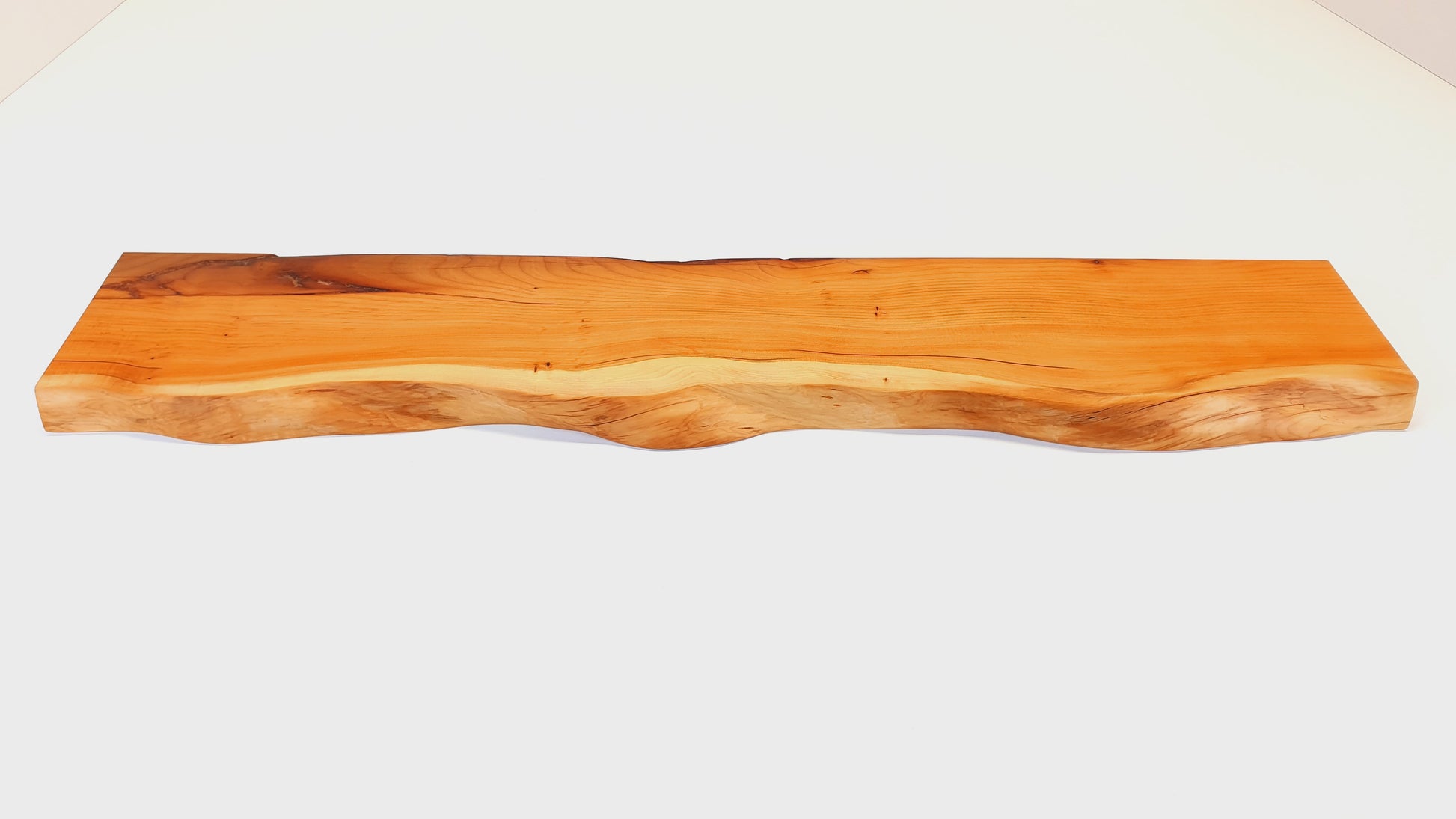 Dieses schwebende Wandboard aus massiver Eibe ist ein echtes Highlight für Liebhaber edler Hölzer. Die außergewöhnliche Maserung und die warme, rötlich-goldene Farbgebung verleihen dem Regal eine unvergleichliche Eleganz. Die natürliche Baumkante unterstreicht den einzigartigen Charakter und macht jedes Stück zu einem handgefertigten Unikat.