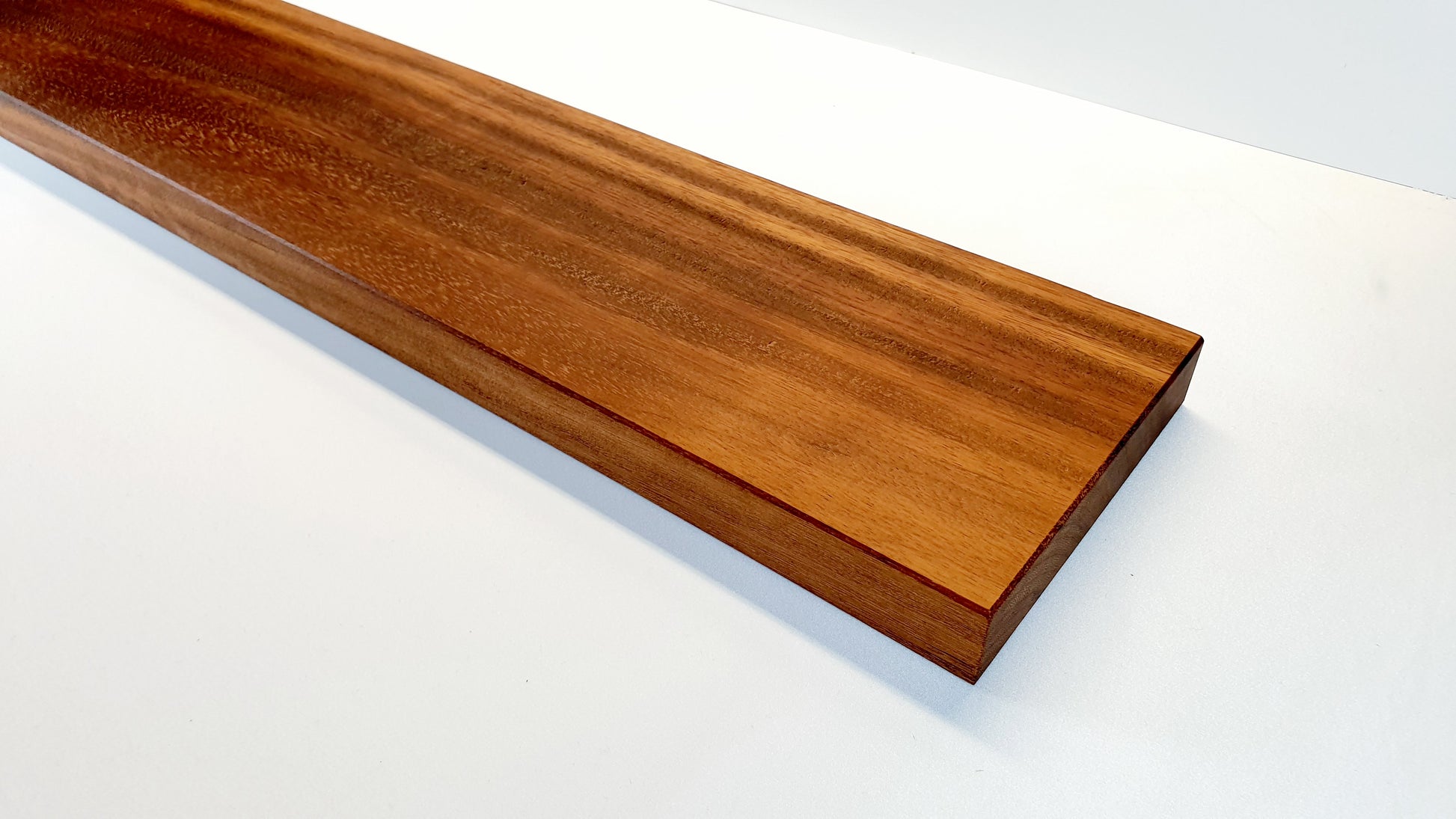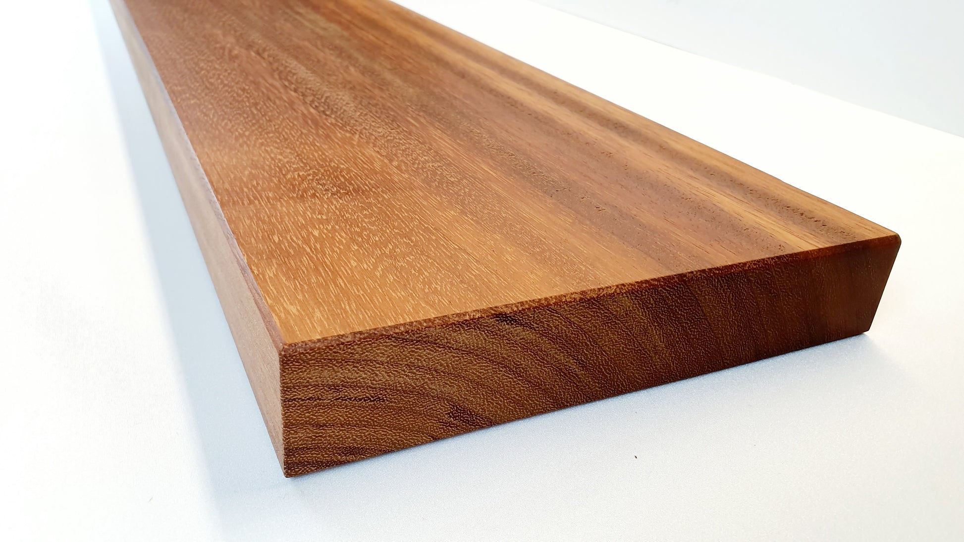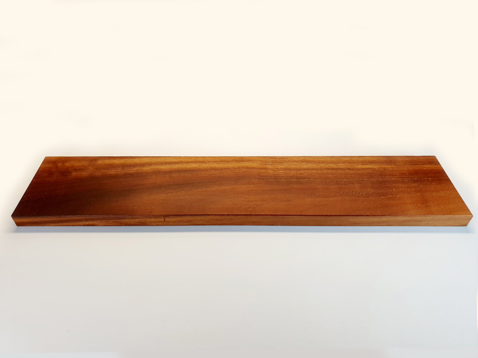 Kambala-Massivholz besticht durch seine warme, goldbraune Farbgebung und die dekorative Maserung. Das afrikanische Hartholz ist bekannt für seine Widerstandsfähigkeit und hohe Tragkraft, was es perfekt für schwebende Wandregale macht.