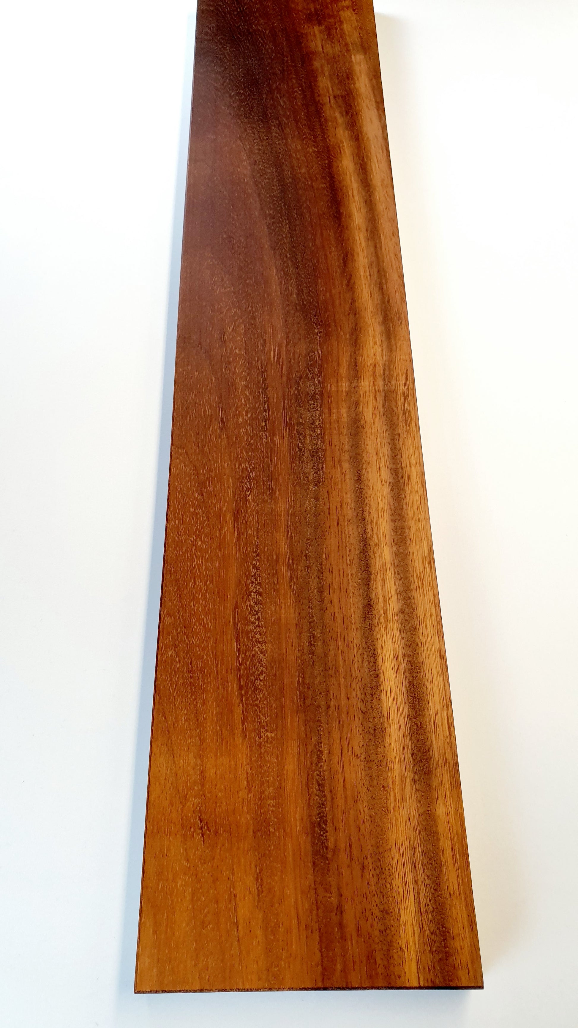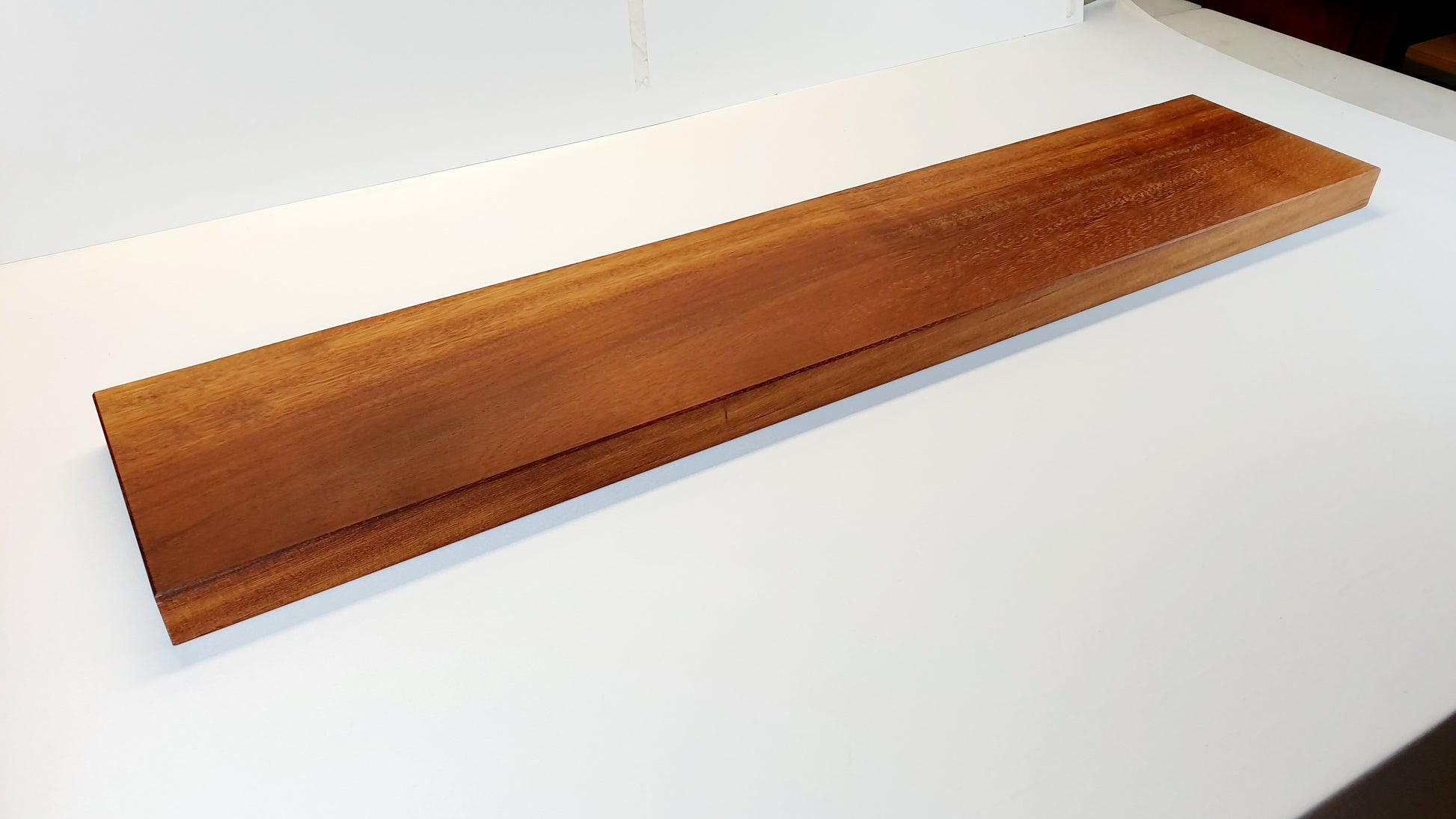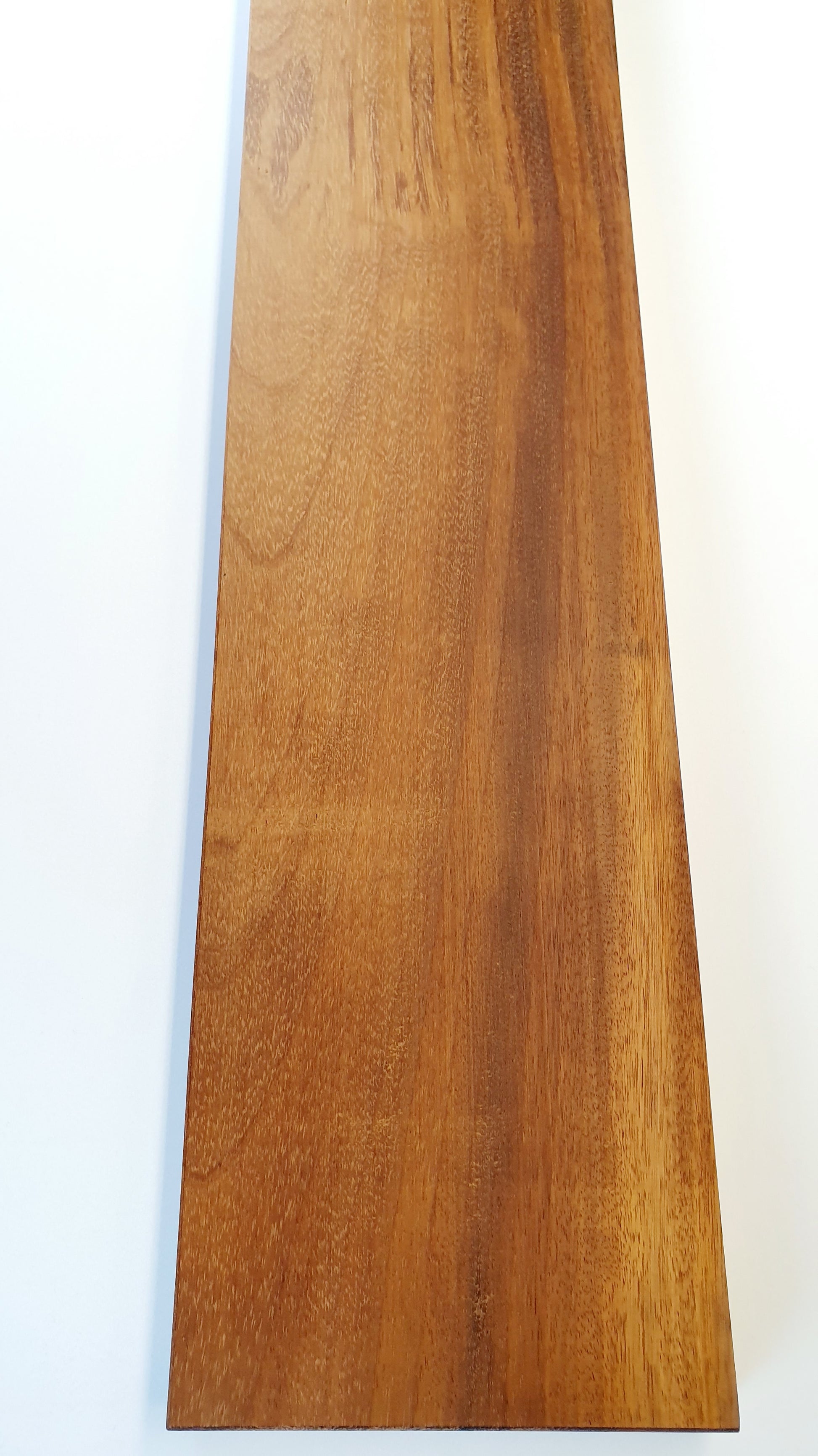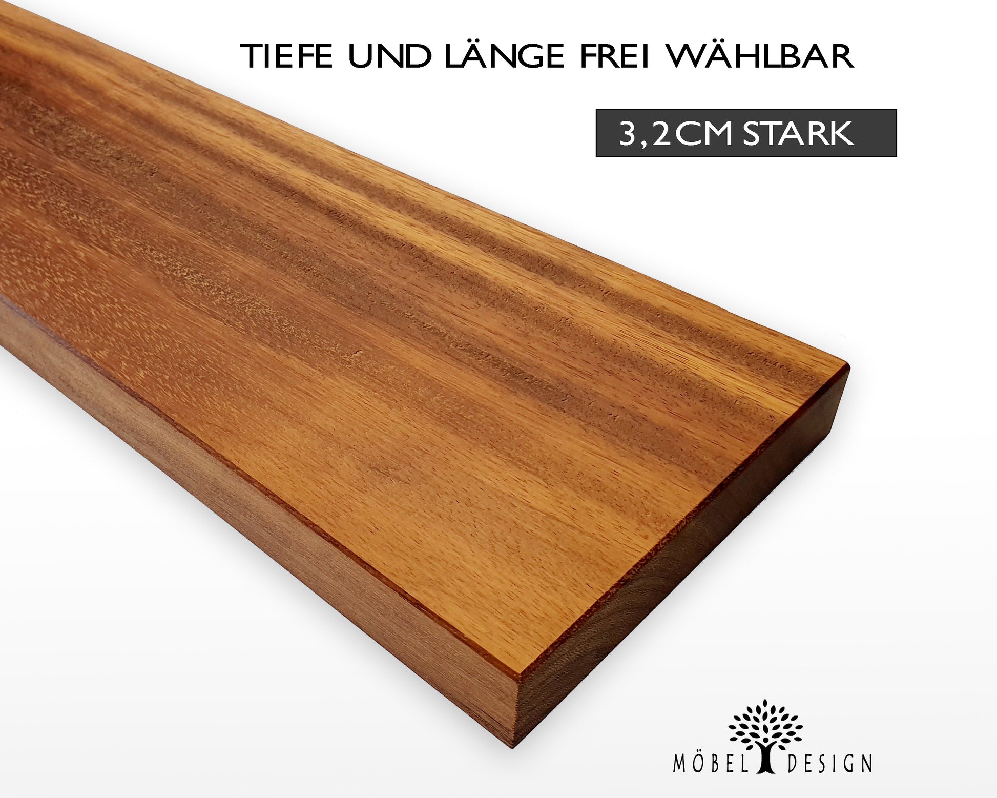 Kambala-Massivholz besticht durch seine warme, goldbraune Farbgebung und die dekorative Maserung. Das afrikanische Hartholz ist bekannt für seine Widerstandsfähigkeit und hohe Tragkraft, was es perfekt für schwebende Wandregale macht.