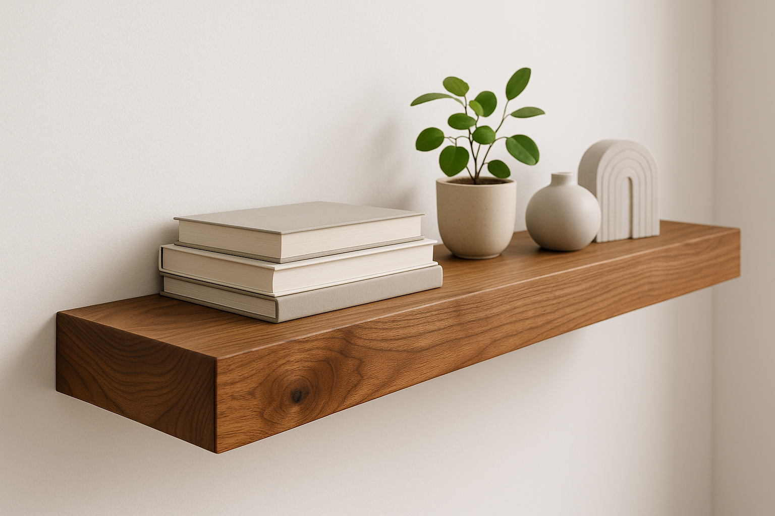 Du bestimmst die Länge (20–290 cm), Tiefe und Stärke. Auf Wunsch mit echter Baumkante für ein besonders naturverbundenes Erscheinungsbild. Durch unsere verdeckte Aufhängung wirkt das Regal schwebend und elegant – ganz ohne sichtbare Winkel. -