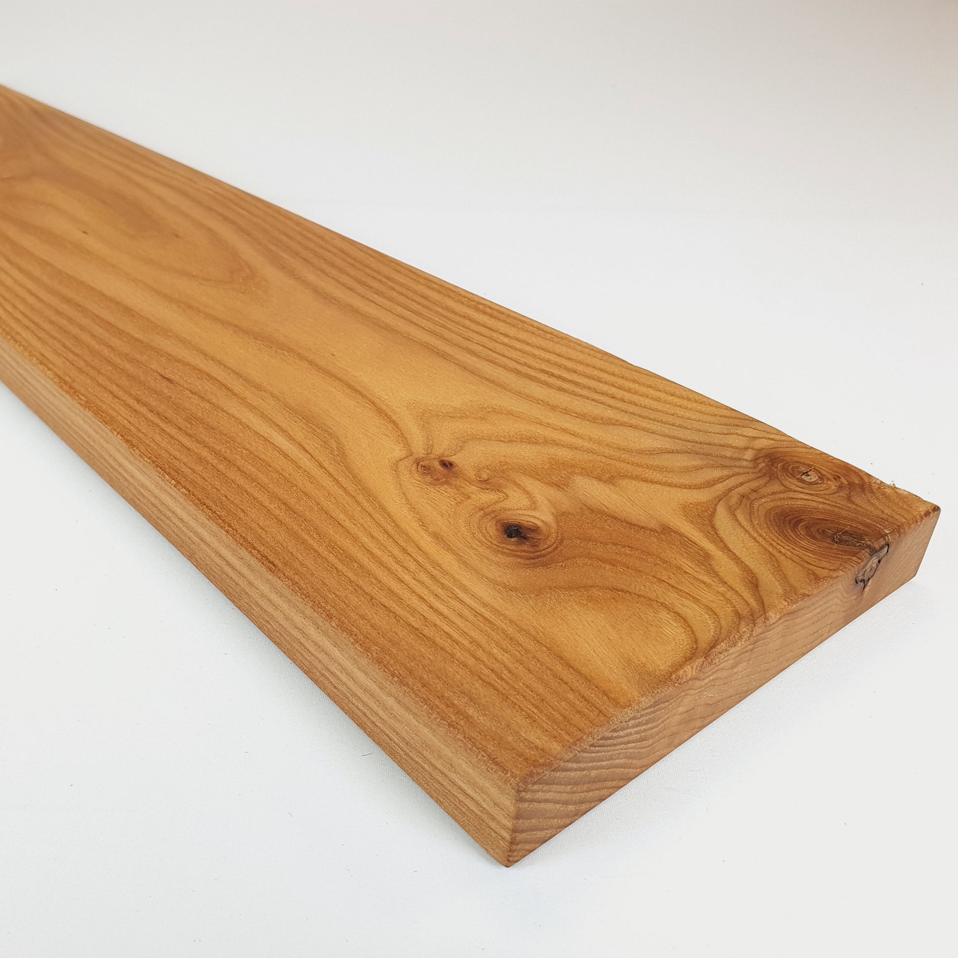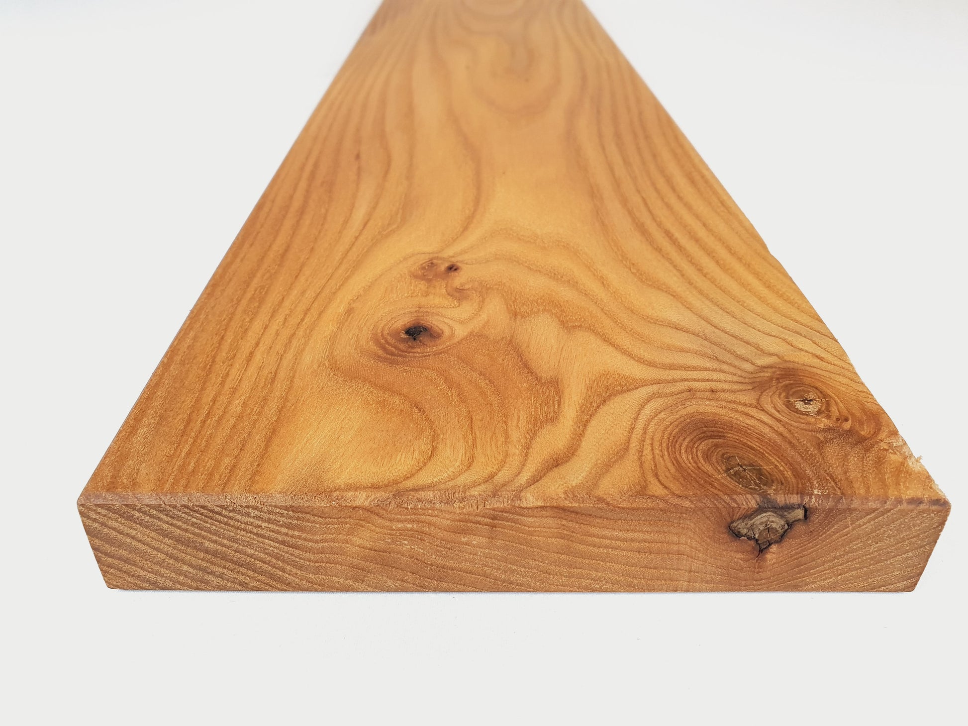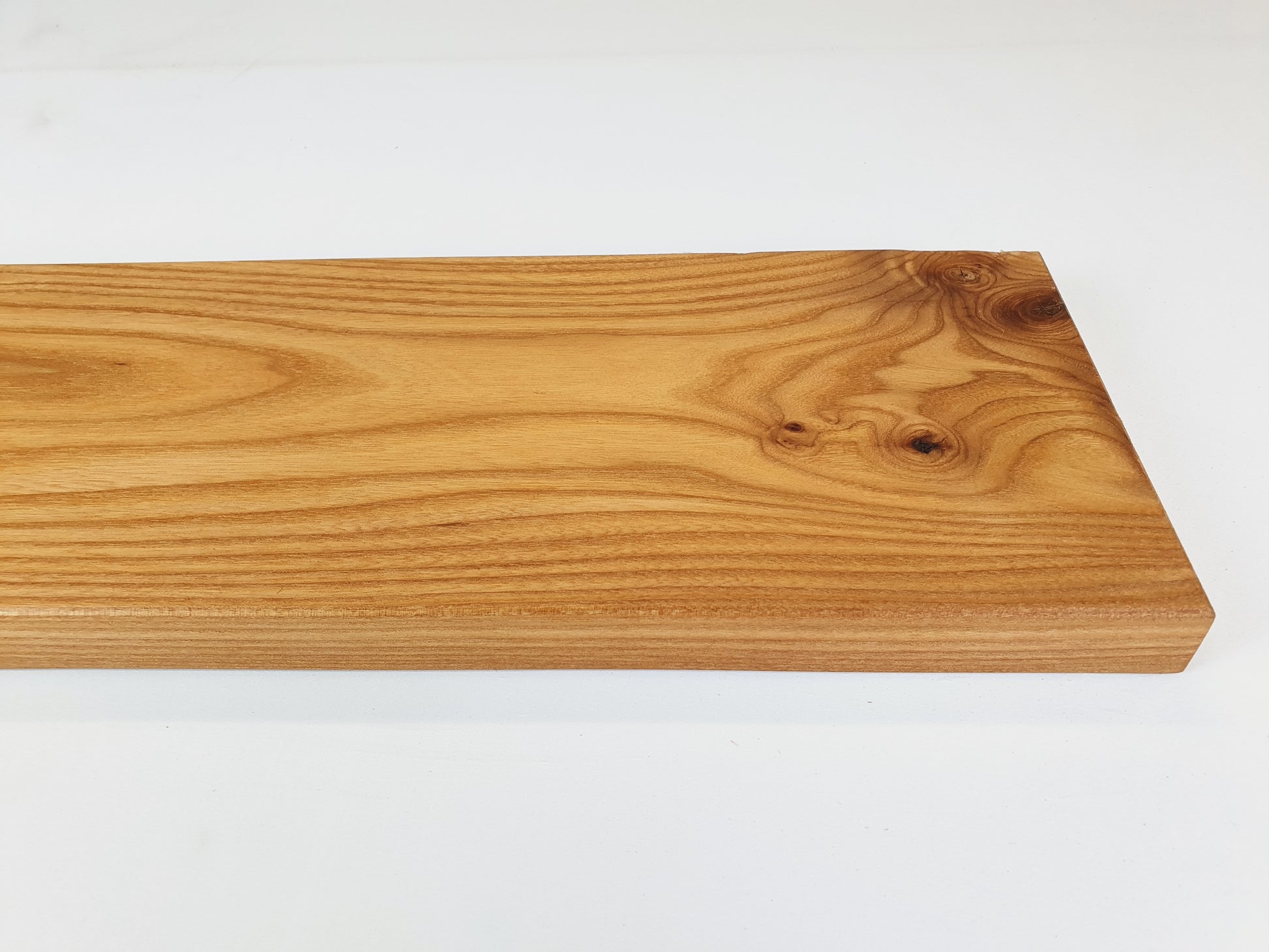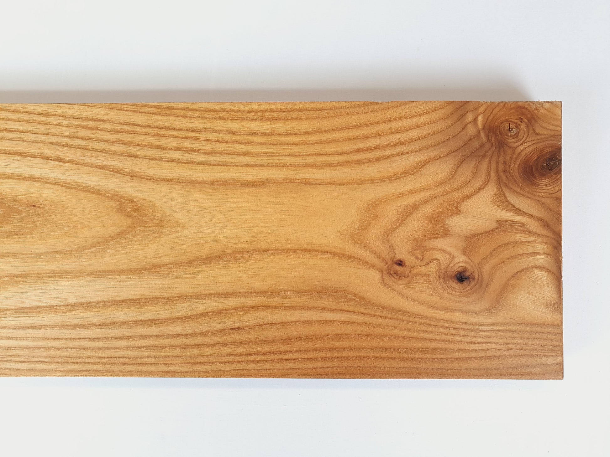 Dieses Wandregal aus massivem Ulmenholz vereint natürliche Schönheit mit hoher Stabilität. Die charaktervolle, leicht gewellte Maserung und die warmen Farbtöne von goldbraun bis rötlich machen jedes Regal zu einem Unikat.